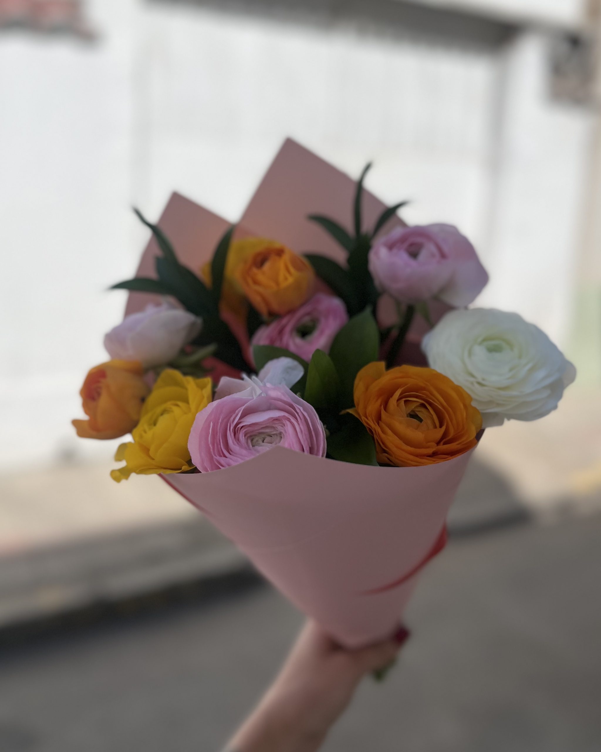 Incluye 10 varas de Ranúnculos multicolor + follaje, envueltos en el papel del día.