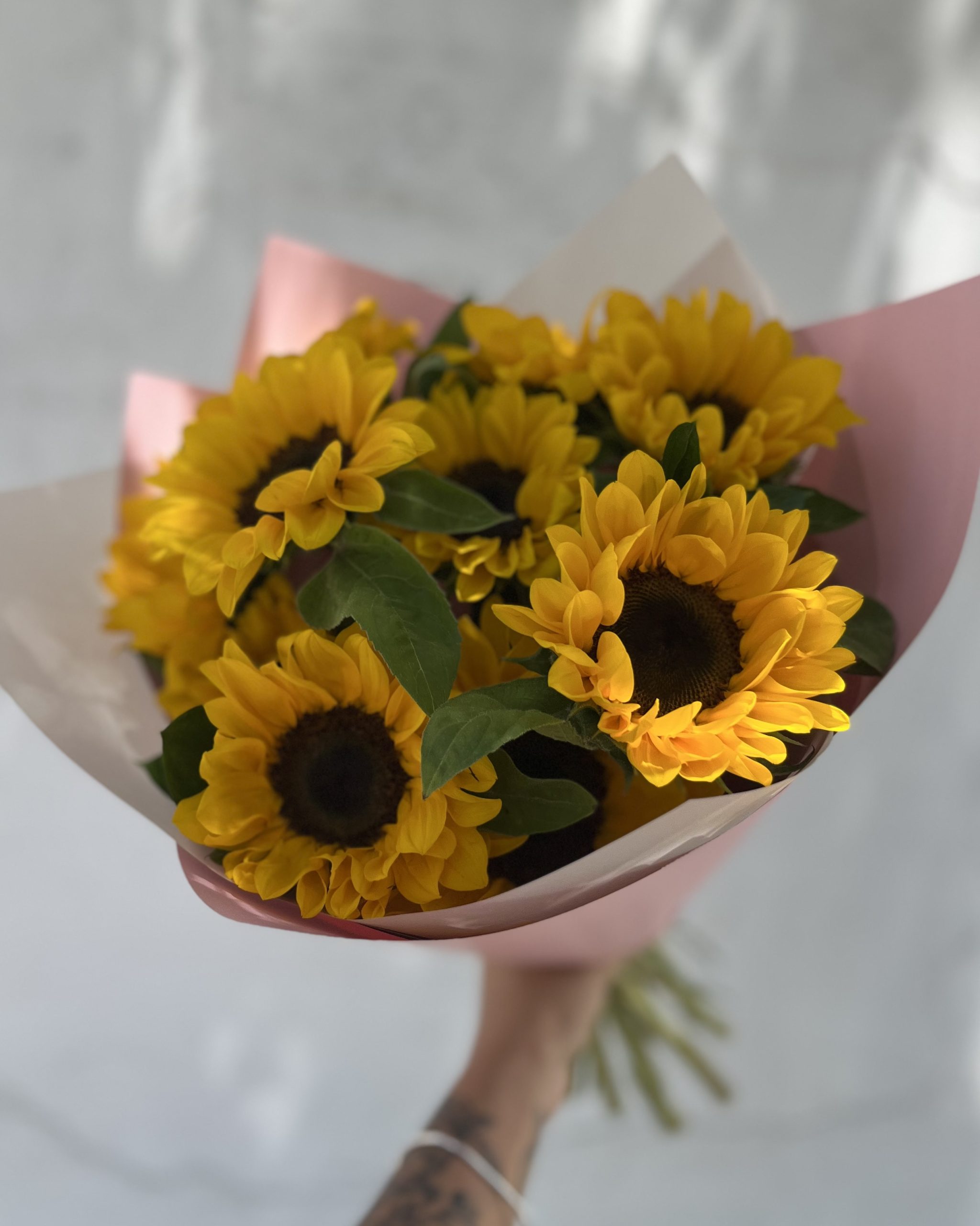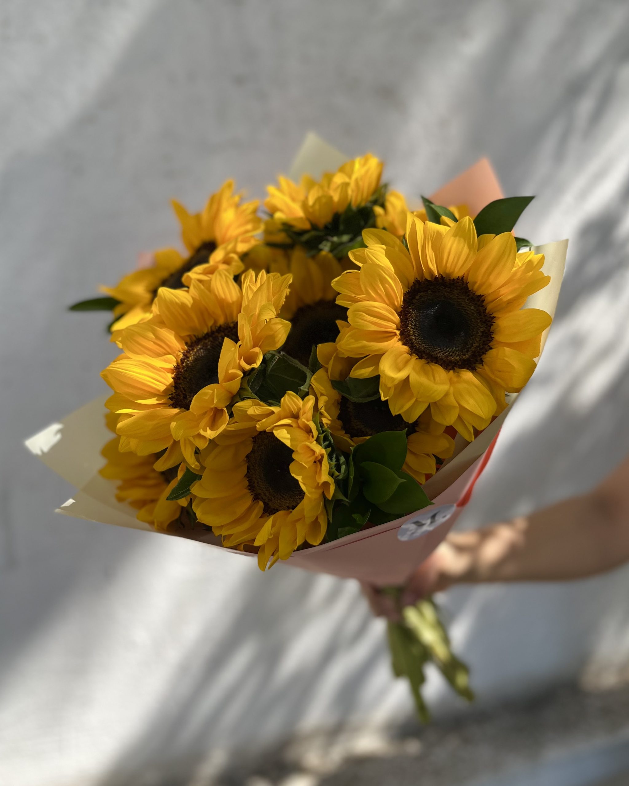 Ramo de 10 varas de girasoles, envueltos en la papelería del día.