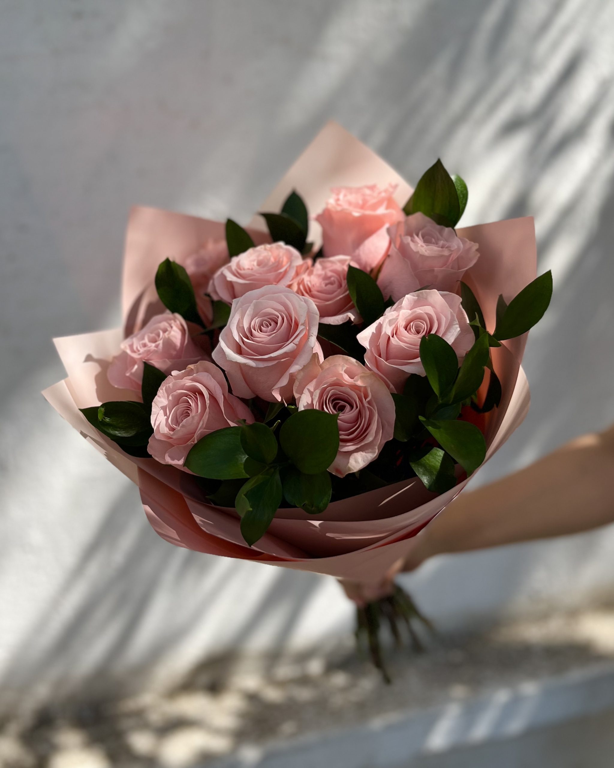 Ramo de 10 rosas en tonos rosados más follaje, envuelto en la papelería del día.