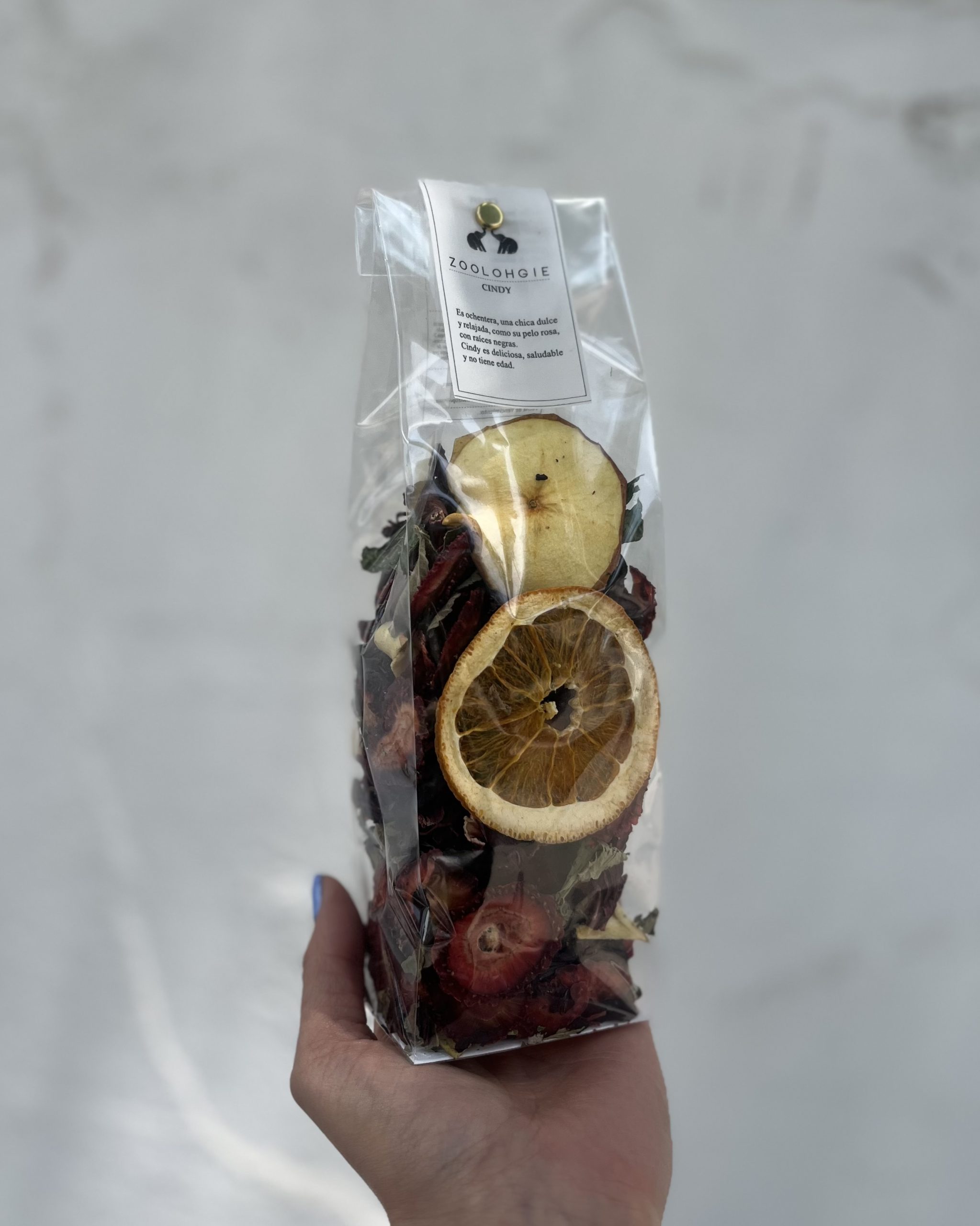 Ingredientes: Frutilla, capullos de rosa, lavanda, melisa, flor de hibisco, rosa mosqueta, hojas de stevia, naranja, hojas de frambuesa.